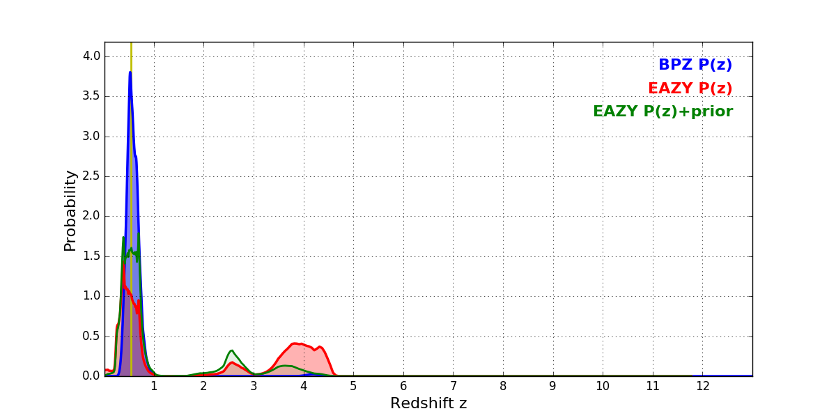 In P(z) plots: Yellow lines mark the cluster redshift z = 0.546,