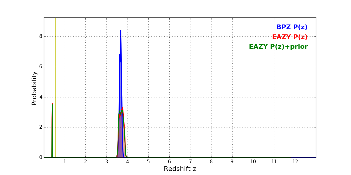 In P(z) plots: Yellow lines mark the cluster redshift z = 0.546,