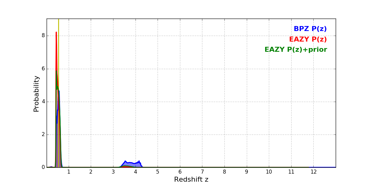 In P(z) plots: Yellow lines mark the cluster redshift z = 0.546,