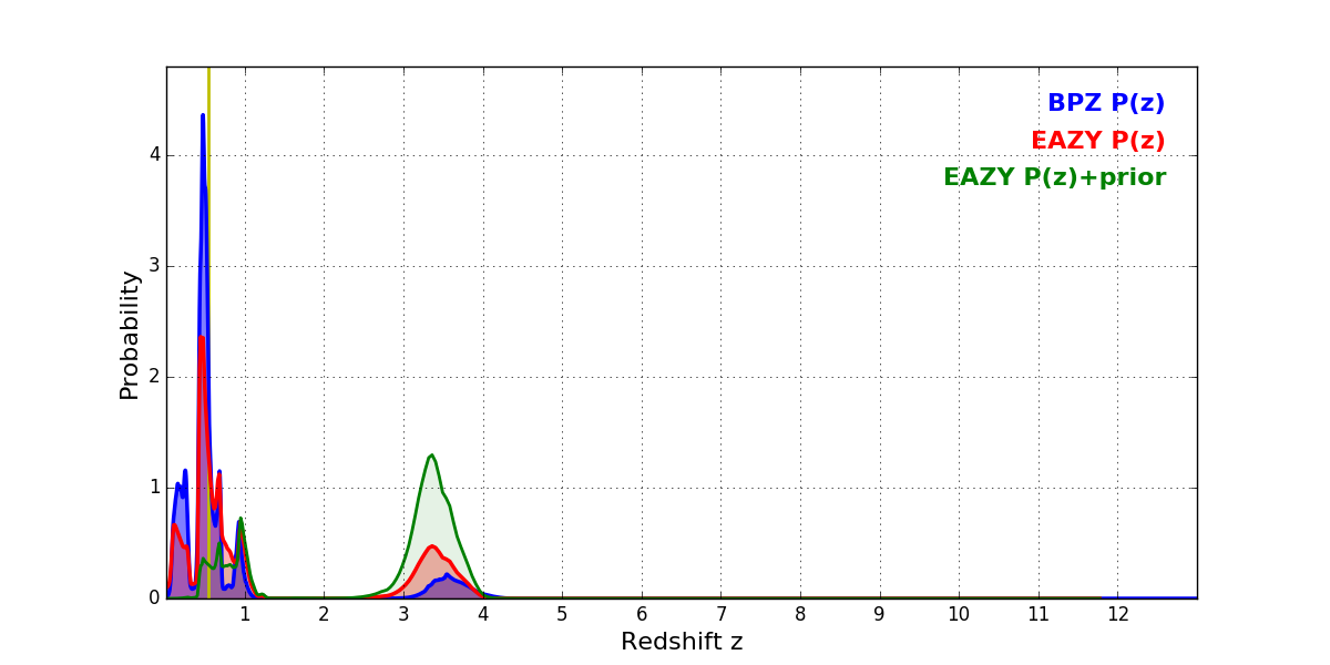 In P(z) plots: Yellow lines mark the cluster redshift z = 0.546,