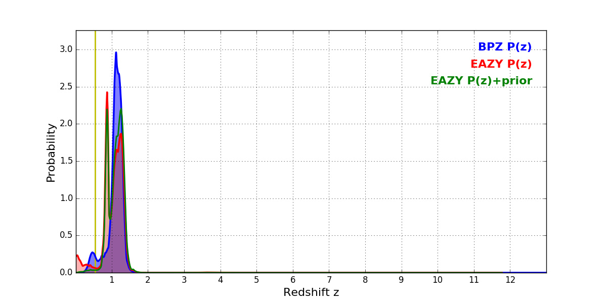 In P(z) plots: Yellow lines mark the cluster redshift z = 0.546,