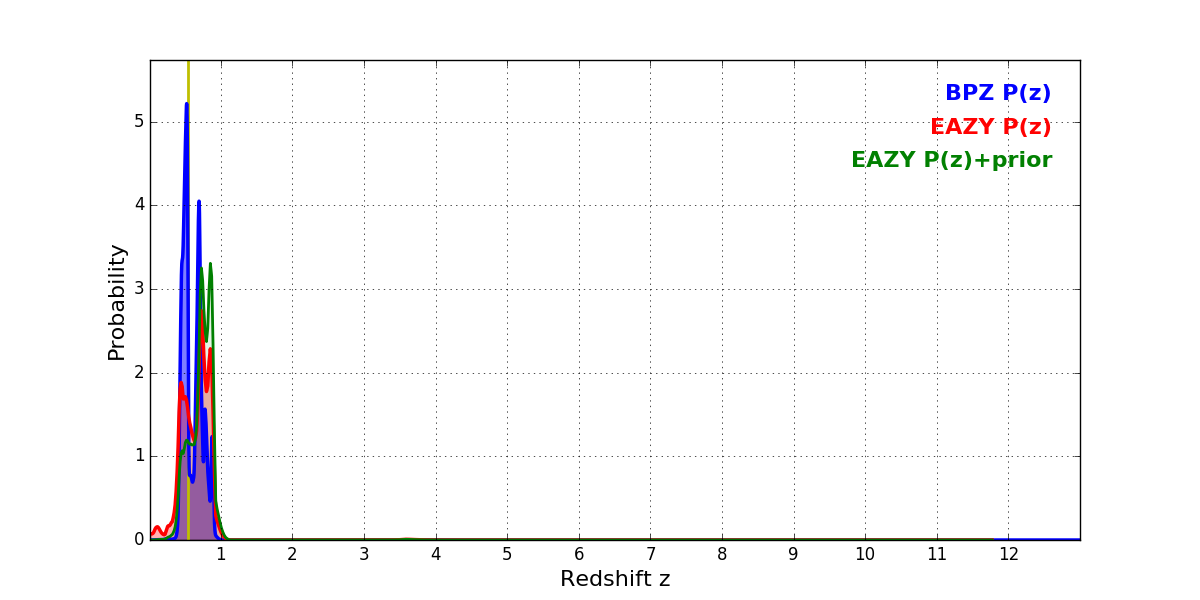 In P(z) plots: Yellow lines mark the cluster redshift z = 0.546,