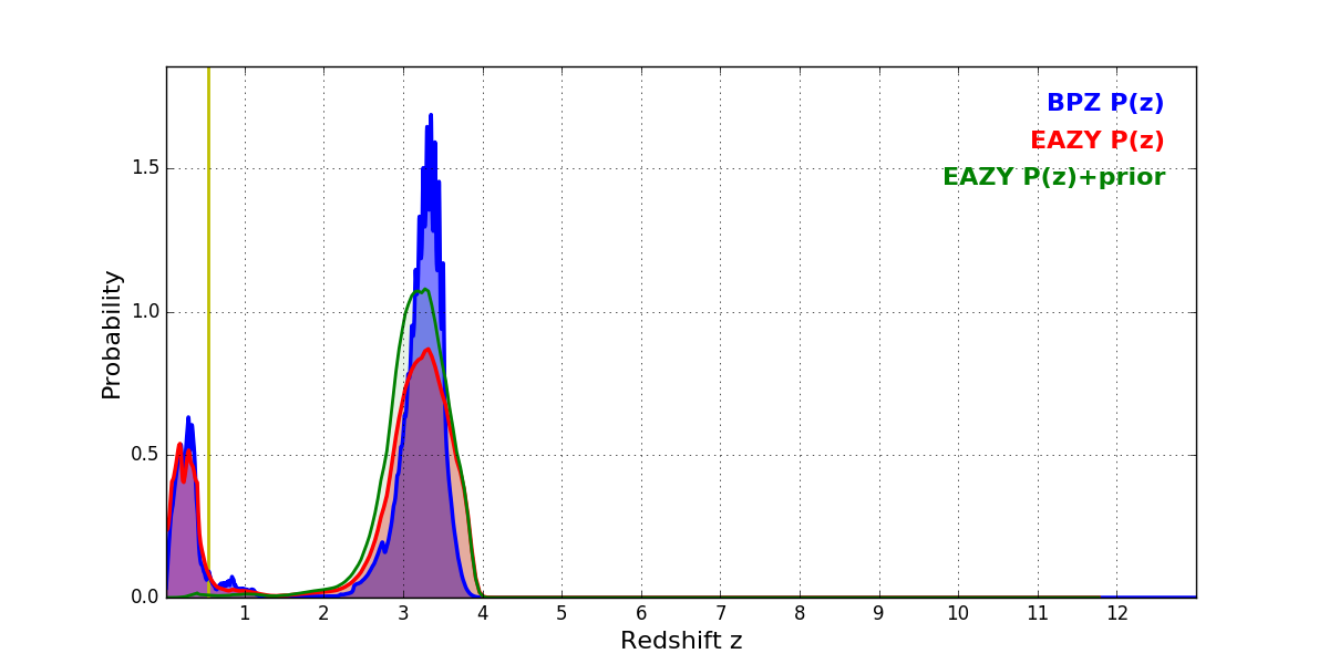 In P(z) plots: Yellow lines mark the cluster redshift z = 0.546,