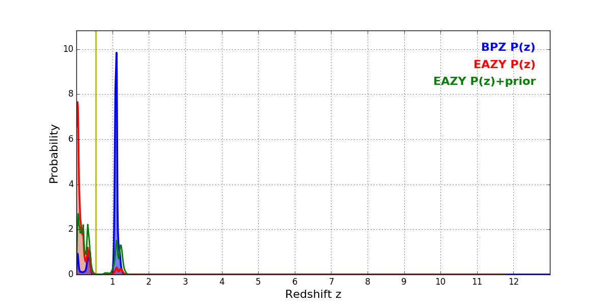 In P(z) plots: Yellow lines mark the cluster redshift z = 0.546,