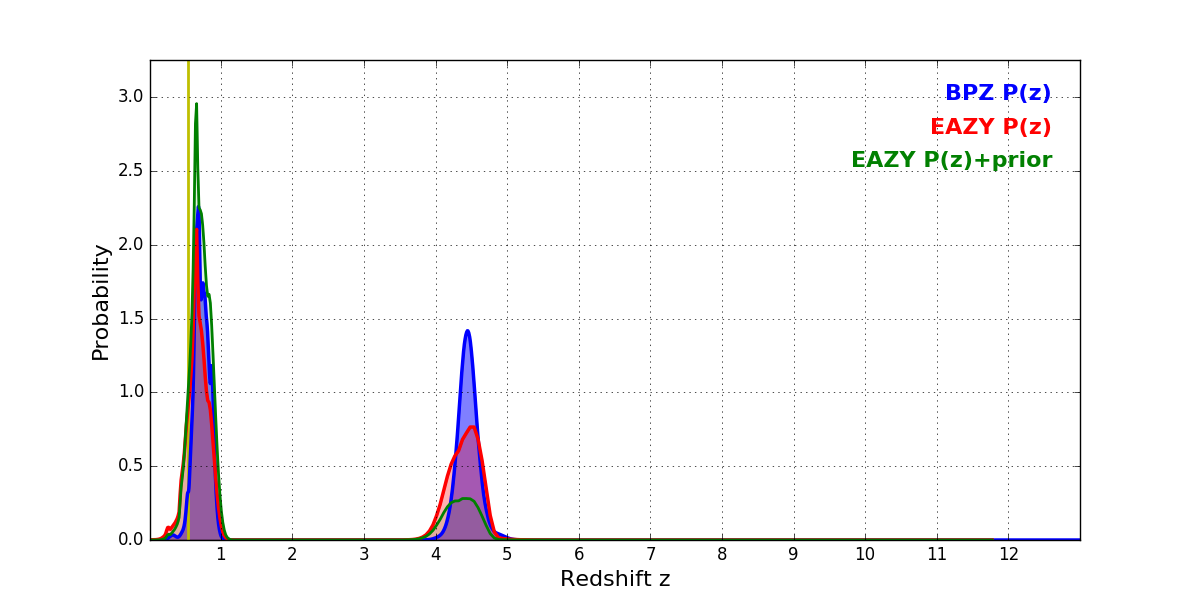 In P(z) plots: Yellow lines mark the cluster redshift z = 0.546,