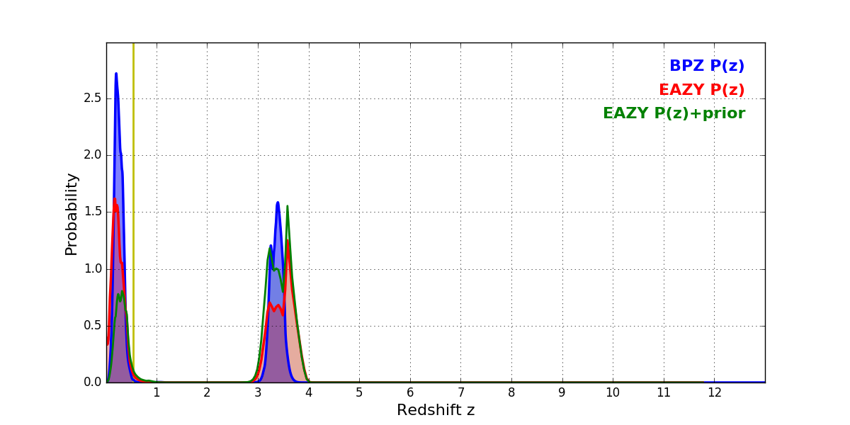 In P(z) plots: Yellow lines mark the cluster redshift z = 0.546,