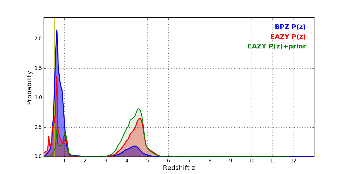 In P(z) plots: Yellow lines mark the cluster redshift z = 0.546,