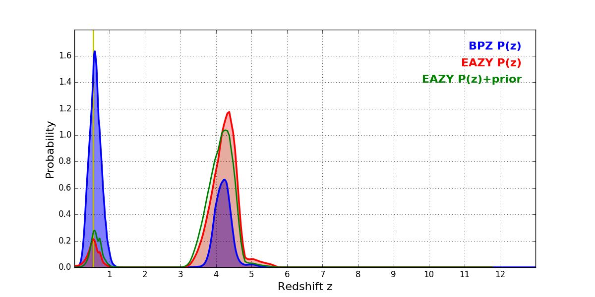 In P(z) plots: Yellow lines mark the cluster redshift z = 0.546,