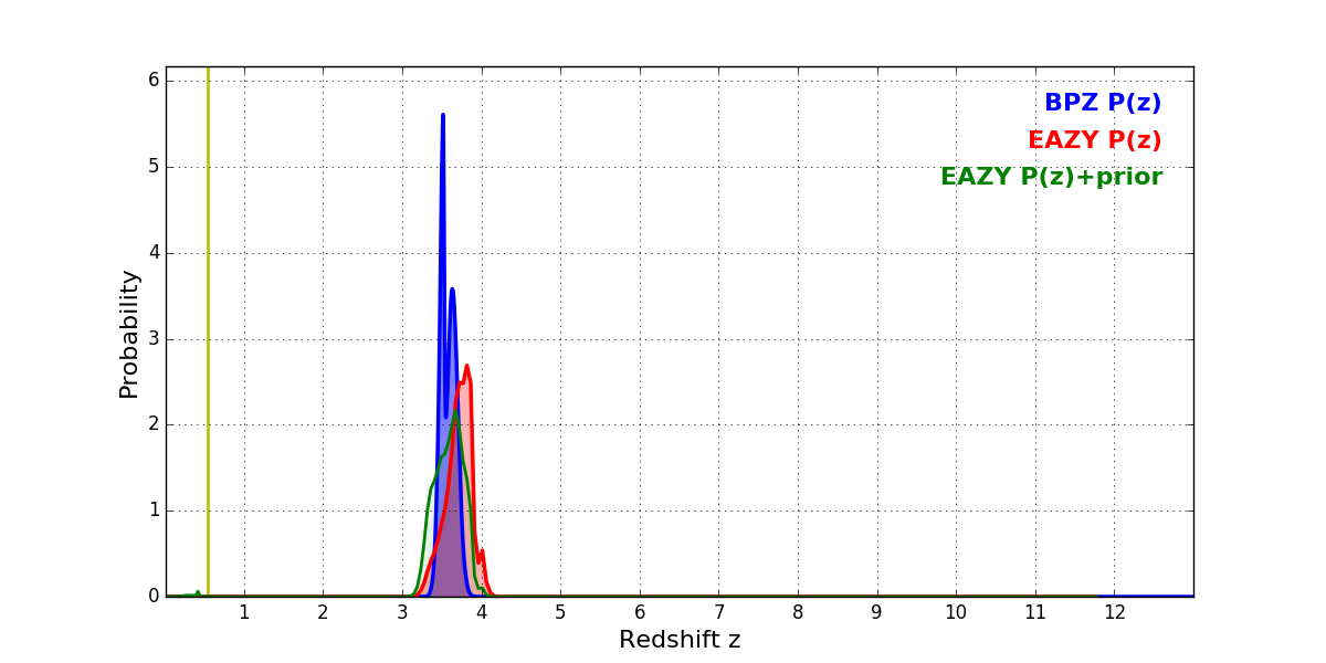In P(z) plots: Yellow lines mark the cluster redshift z = 0.546,