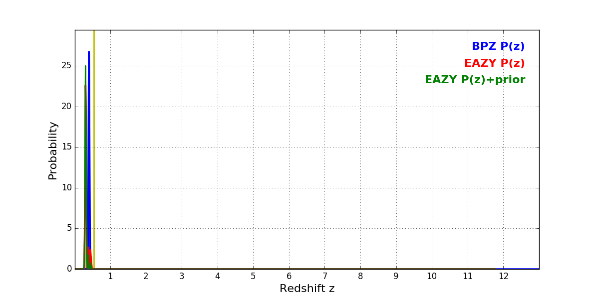 In P(z) plots: Yellow lines mark the cluster redshift z = 0.546,
