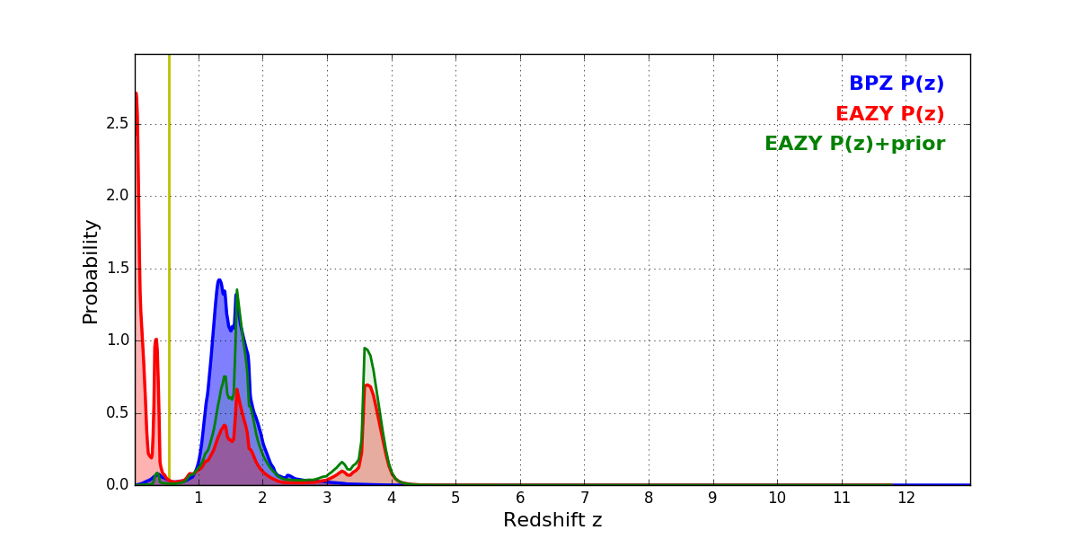 In P(z) plots: Yellow lines mark the cluster redshift z = 0.546,
