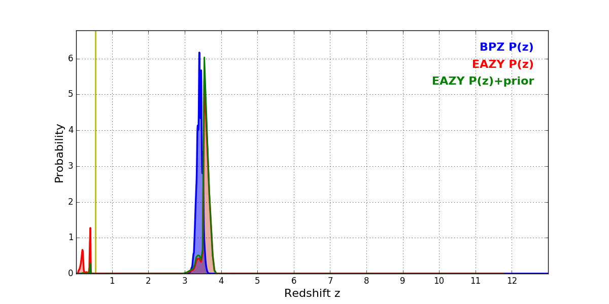 In P(z) plots: Yellow lines mark the cluster redshift z = 0.546,