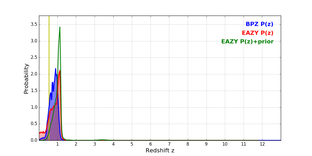 In P(z) plots: Yellow lines mark the cluster redshift z = 0.546,