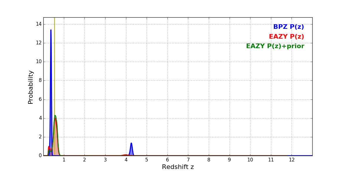 In P(z) plots: Yellow lines mark the cluster redshift z = 0.546,