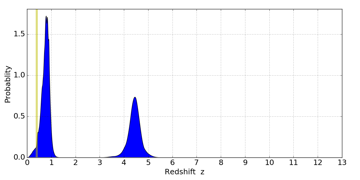 In P(z) plots: Yellow lines mark the cluster redshift z = 0.396,