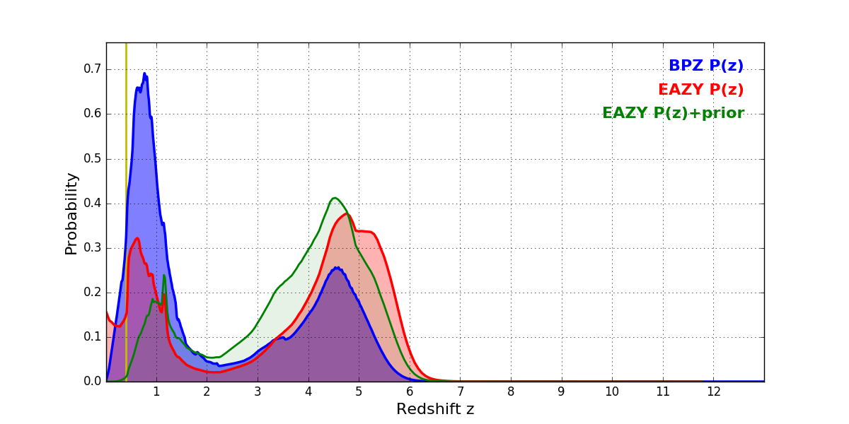 In P(z) plots: Yellow lines mark the cluster redshift z = 0.396,