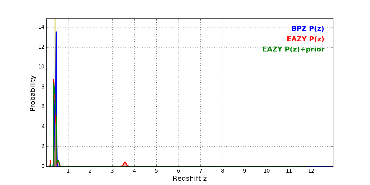 In P(z) plots: Yellow lines mark the cluster redshift z = 0.396,