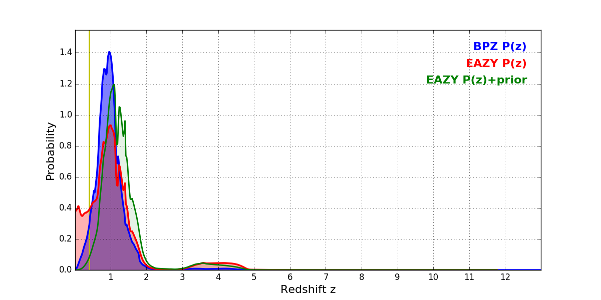 In P(z) plots: Yellow lines mark the cluster redshift z = 0.396,