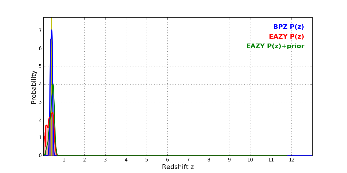 In P(z) plots: Yellow lines mark the cluster redshift z = 0.396,