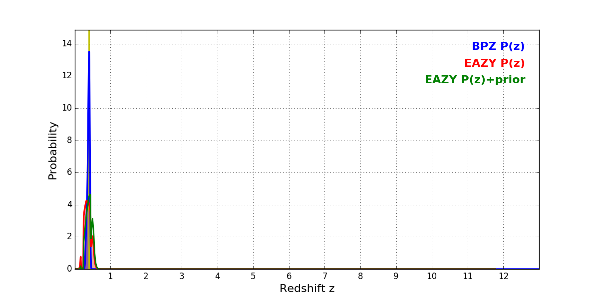 In P(z) plots: Yellow lines mark the cluster redshift z = 0.396,