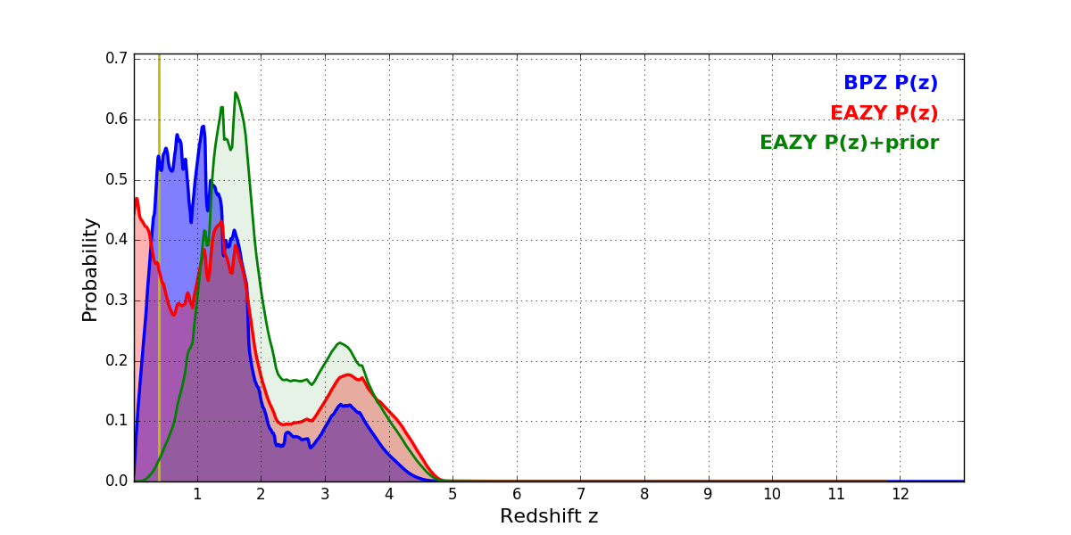 In P(z) plots: Yellow lines mark the cluster redshift z = 0.396,