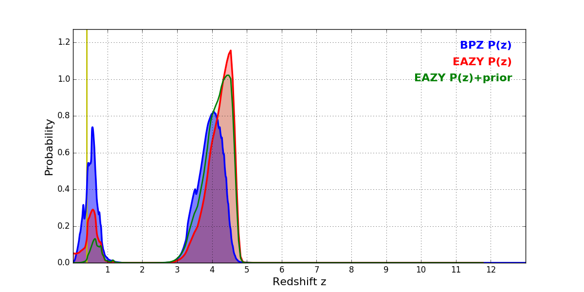 In P(z) plots: Yellow lines mark the cluster redshift z = 0.396,