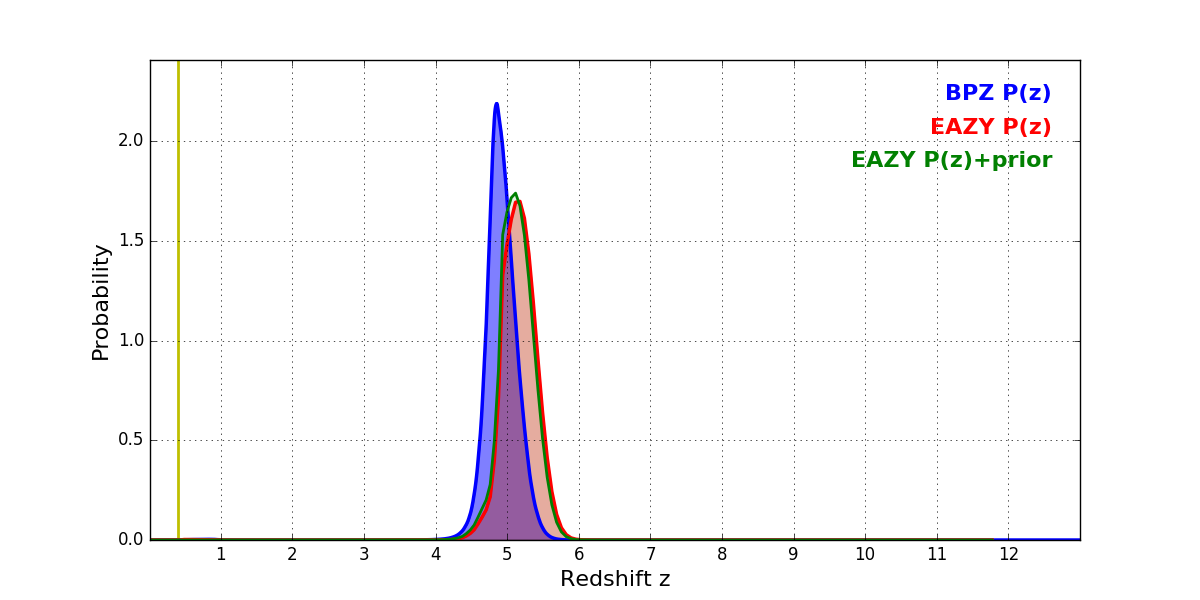 In P(z) plots: Yellow lines mark the cluster redshift z = 0.396,