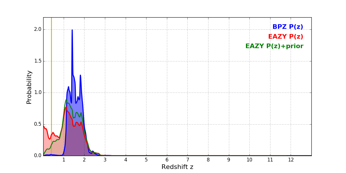 In P(z) plots: Yellow lines mark the cluster redshift z = 0.396,