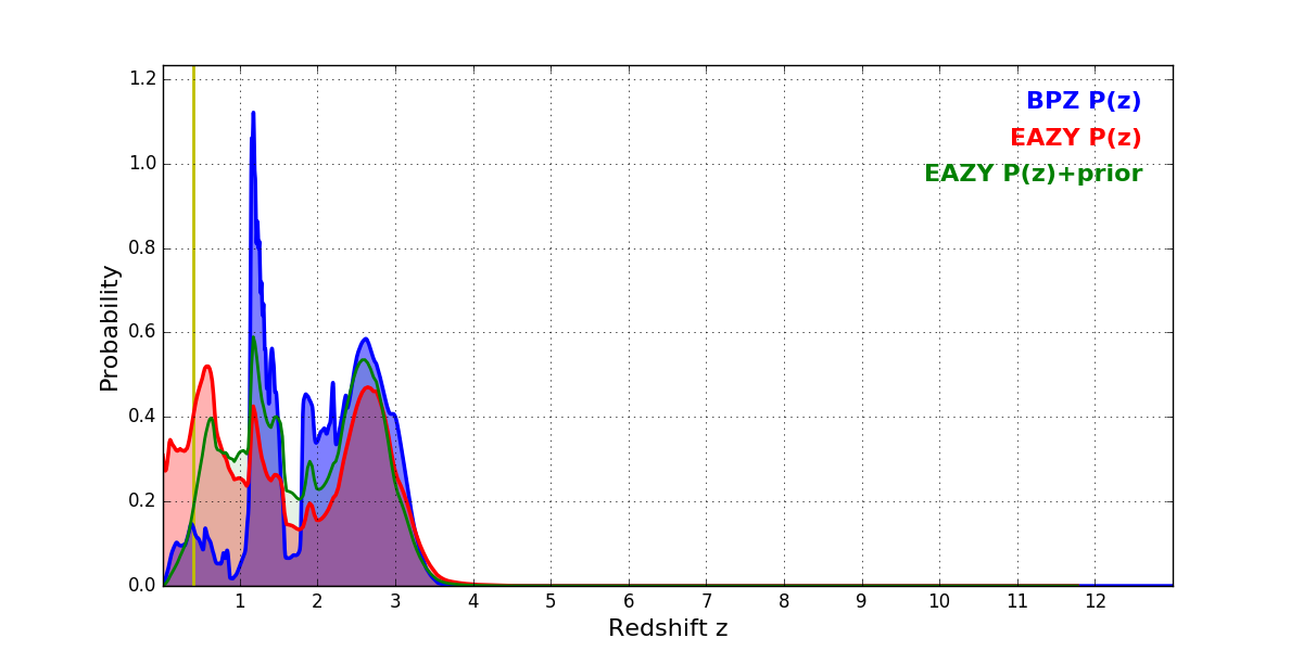 In P(z) plots: Yellow lines mark the cluster redshift z = 0.396,
