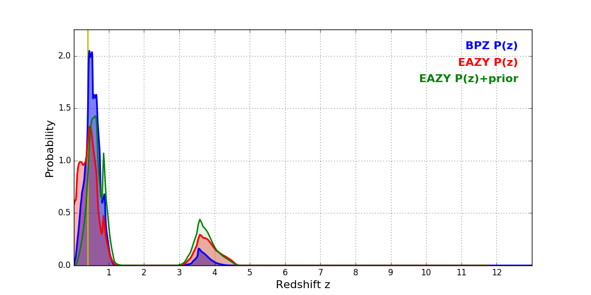 In P(z) plots: Yellow lines mark the cluster redshift z = 0.396,