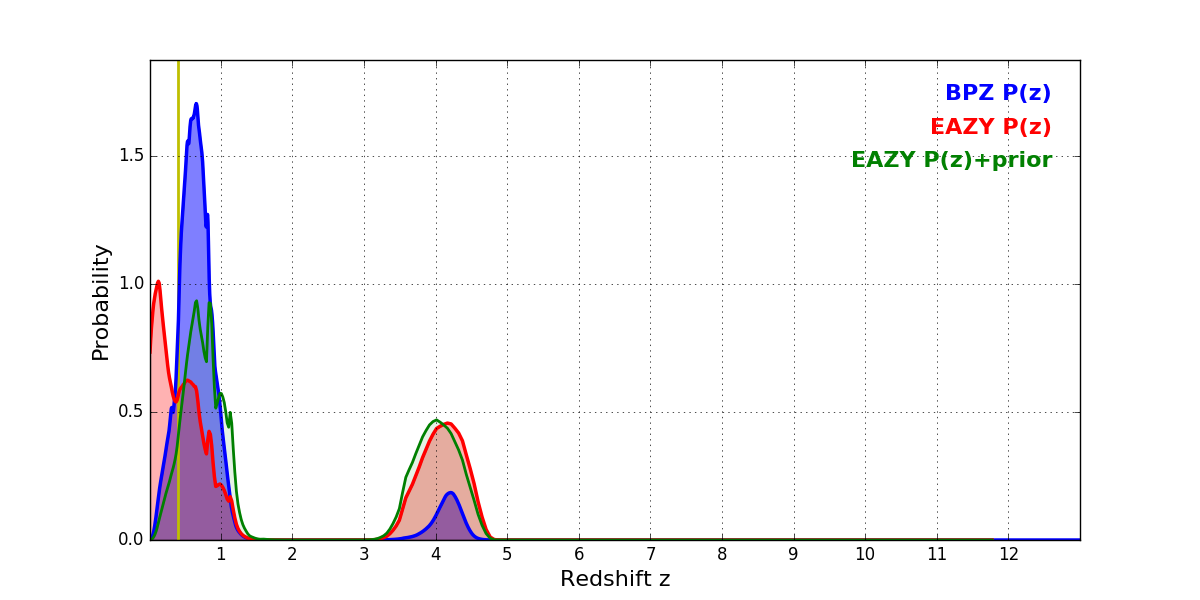 In P(z) plots: Yellow lines mark the cluster redshift z = 0.396,