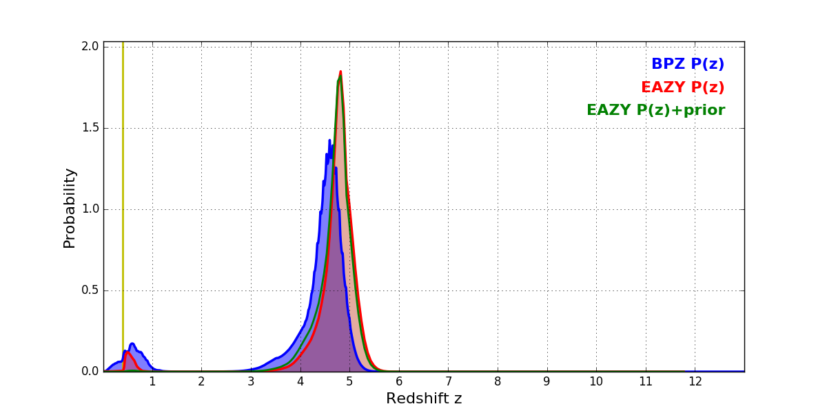In P(z) plots: Yellow lines mark the cluster redshift z = 0.396,