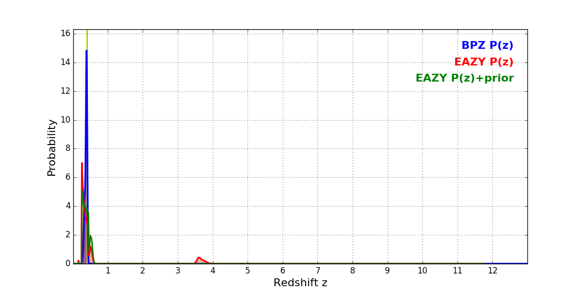 In P(z) plots: Yellow lines mark the cluster redshift z = 0.396,