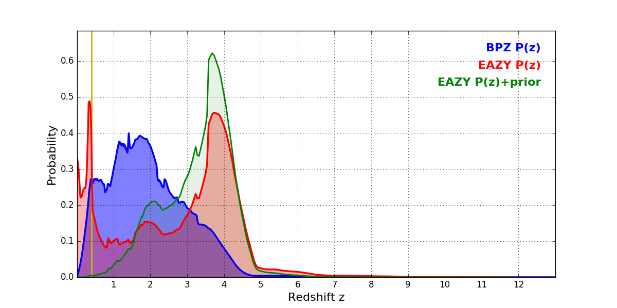 In P(z) plots: Yellow lines mark the cluster redshift z = 0.396,