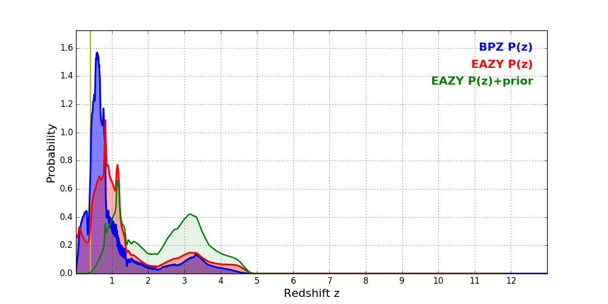 In P(z) plots: Yellow lines mark the cluster redshift z = 0.396,