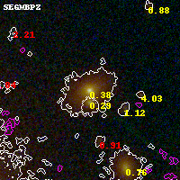 Object #1527 x,y = (2609, 3207) RA, Dec = (00:32:10.800, 18:08:35.16) = (8.04500, 18.14310) BPZ = 0.380 [0.292--0.423] type = 4.20 (Ell4_A_0 - ES0_B10) chisq2 = 0.07 ODDS = 0.83 z_cluster = 0.396