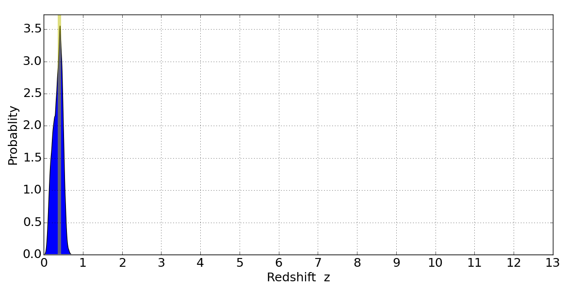In P(z) plots: Yellow lines mark the cluster redshift z = 0.396,