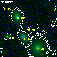 Object #1069 x,y = (2249, 3706) RA, Dec = (00:32:12.312, 18:09:05.04) = (8.05130, 18.15140) BPZ = 0.704 [0.314--1.827] type = 8.70 (SB2_B10 - SB1_B10) chisq2 = 0.03 ODDS = 0.15 z_cluster = 0.396