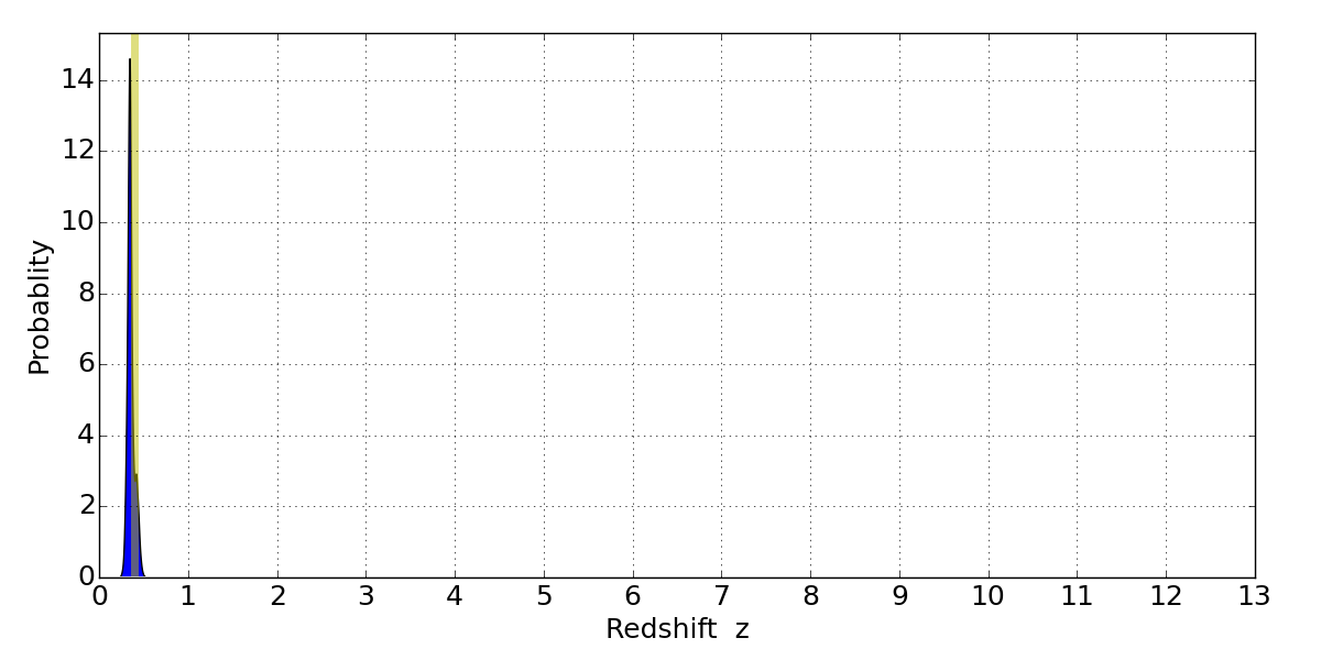 In P(z) plots: Yellow lines mark the cluster redshift z = 0.396,