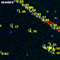 Object #2182 x,y = (4416, 2867) RA, Dec = (00:32:03.192, 18:08:15.00) = (8.01330, 18.13750) BPZ = 0.762 [0.555--1.666] type = 8.50 (SB2_B10 - SB1_B10) chisq2 = 0.01 ODDS = 0.20 z_cluster = 0.396