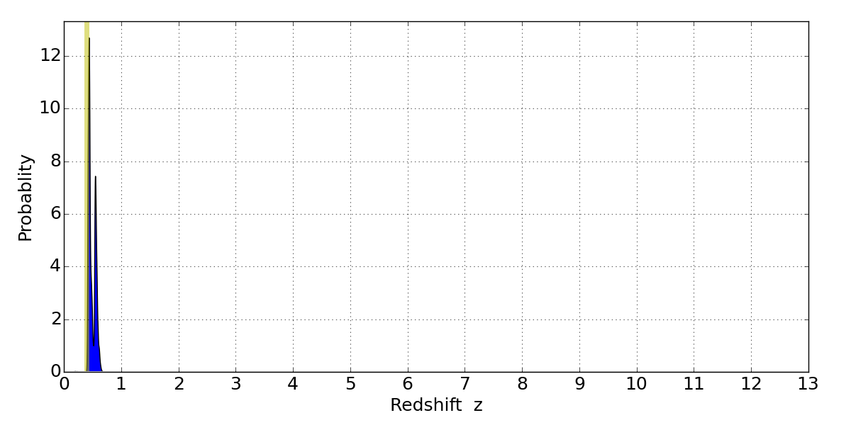 In P(z) plots: Yellow lines mark the cluster redshift z = 0.396,