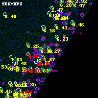 Object #3535 x,y = (4397, 2227) RA, Dec = (00:32:03.264, 18:07:36.48) = (8.01360, 18.12680) BPZ = 6.273 [5.895--8.842] type = 9.00 (SB2_B10) chisq2 = 0.00 ODDS = 0.40 z_cluster = 0.396