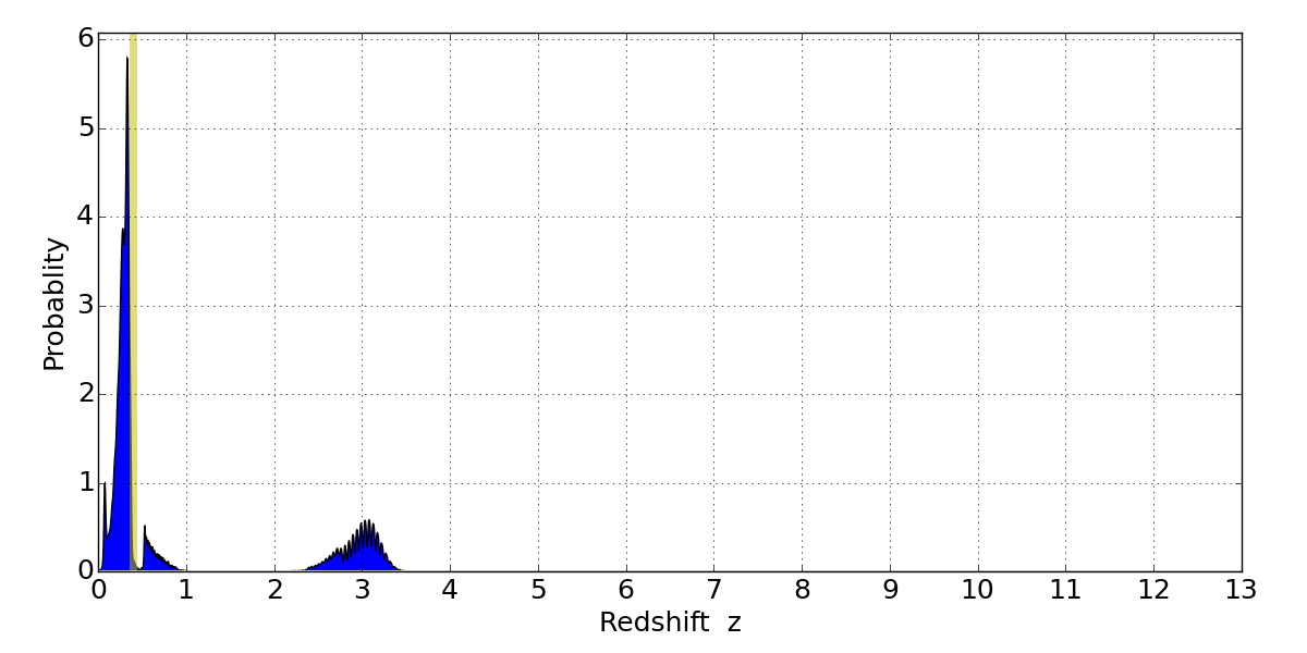 In P(z) plots: Yellow lines mark the cluster redshift z = 0.396,