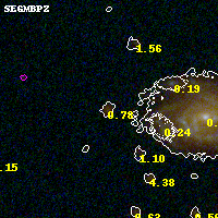 Object #4875 x,y = (2138, 1364) RA, Dec = (00:32:12.792, 18:06:44.64) = (8.05330, 18.11240) BPZ = 0.775 [0.587--4.406] type = 8.20 (SB1_B10 - SB2_B10) chisq2 = 0.36 ODDS = 0.41 z_cluster = 0.396