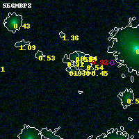 Object #767 x,y = (2887, 3818) RA, Dec = (00:32:09.624, 18:09:11.88) = (8.04010, 18.15330) BPZ = 0.330 [0.190--3.600] type = 9.70 (SB3_B10 - SB2_B10) chisq2 = 0.88 ODDS = 0.12 z_cluster = 0.396