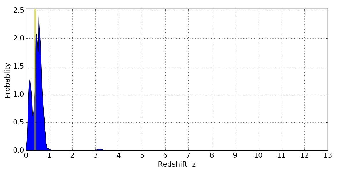 In P(z) plots: Yellow lines mark the cluster redshift z = 0.396,