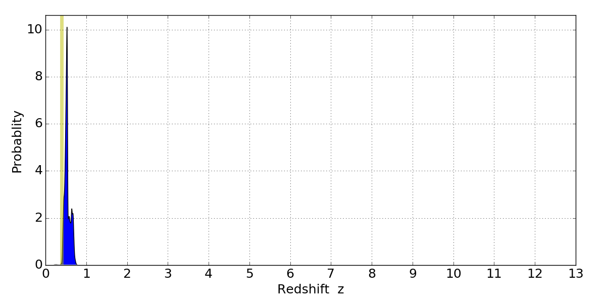 In P(z) plots: Yellow lines mark the cluster redshift z = 0.396,
