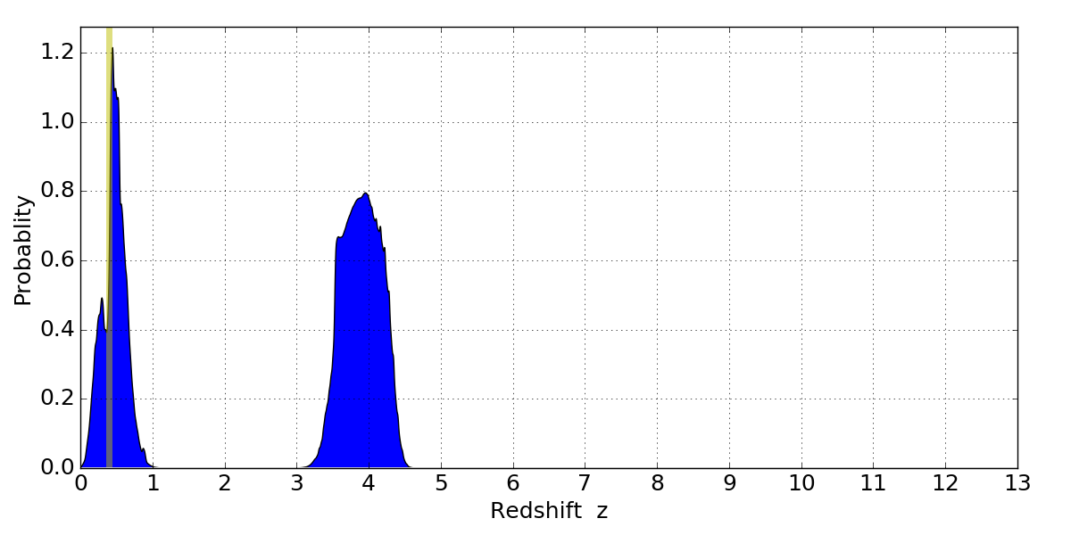 In P(z) plots: Yellow lines mark the cluster redshift z = 0.396,