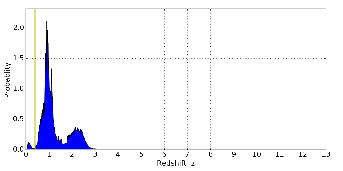 In P(z) plots: Yellow lines mark the cluster redshift z = 0.396,