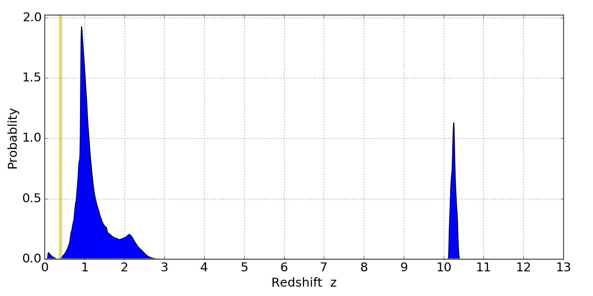 In P(z) plots: Yellow lines mark the cluster redshift z = 0.396,